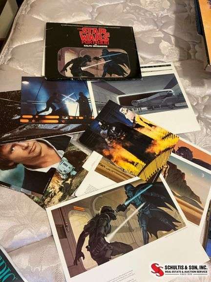 Star Wars-themed prints and photographs, featuring character portraits, concept art, and movie scenes. Some items are text-captioned and depict scenes from the original trilogy.