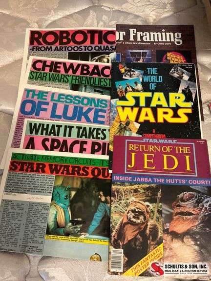 Star Wars-themed booklets, inserts, and posters. Includes 'The World of Star Wars,' character posters, and various publications. General wear visible.