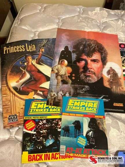 Five original Star Wars-related items including two 'Empire Strikes Back' magazines (Issue 1 'Back in Action' and Issue 4 'AT-AT Attack') and two fold-out posters featuring Princess Leia and a Star Wars character montage. Items show wear consistent with handling and storage.