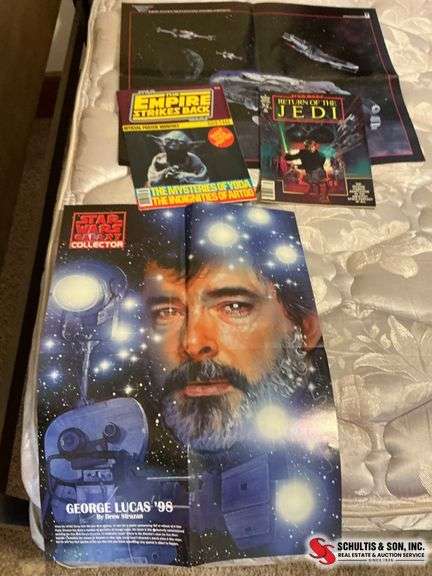 Star Wars-themed posters, magazines, and prints featuring George Lucas, films, and spaceships. Moderate wear visible.