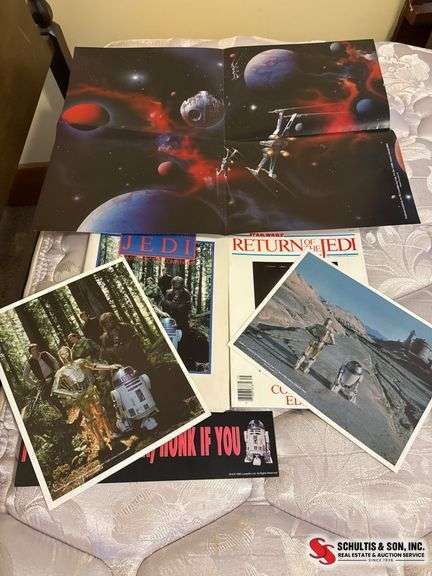 Includes two 'Return of the Jedi' magazines, promotional photos, a poster, and a bumper sticker. Items show light wear.