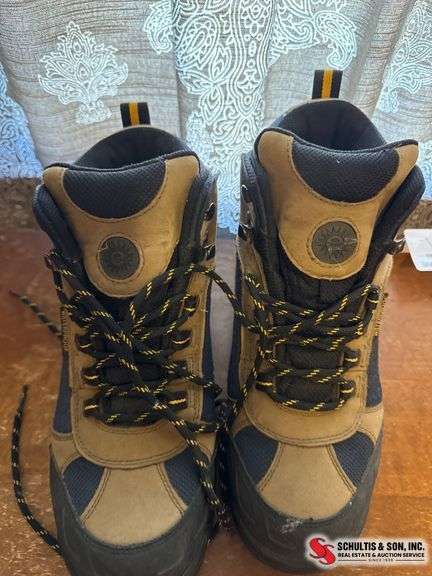 Earth Shoe waterproof hiking boots with leather and textile upper, lace-up closure, and rugged treaded soles. Features branded logo on tongue and outsole.