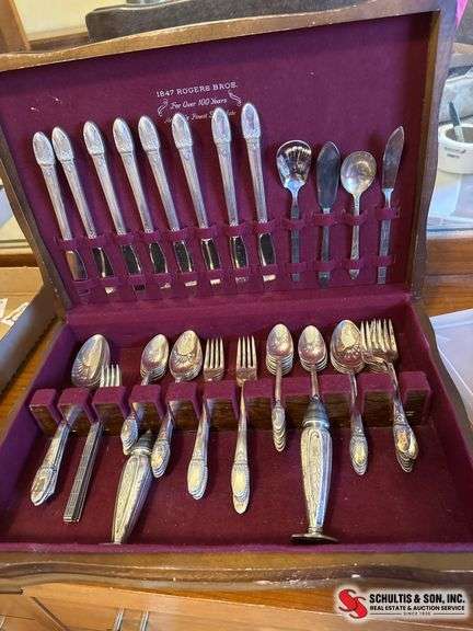An 1847 Rogers Bros silver-plated flatware set in a wood storage box. Includes spoons, forks, knives, and shakers. Moderate wear visible.