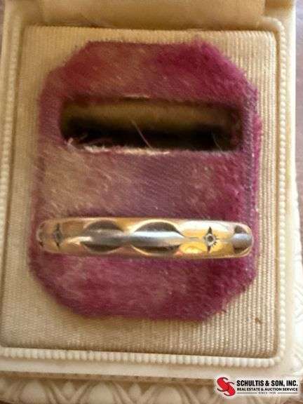14K gold band with engraved details and a small starburst motif. Includes jewelry box from Witt Jewelers, Fairbury, Neb.