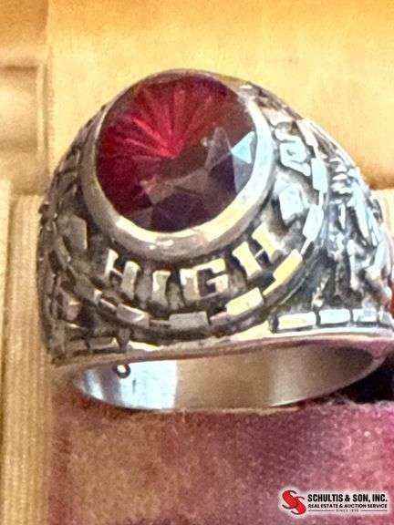 Sterling silver class ring featuring a red faceted stone and engraved details, including school insignias. Inner band marked 'Sterling.'.
