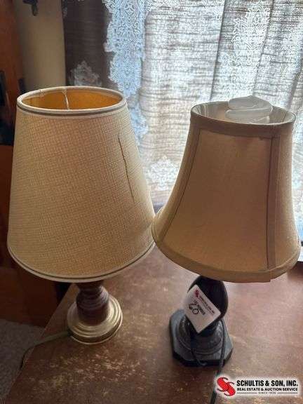 Table lamps with carved wood bases and fabric shades. One shade shows a visible tear. Lamps display signs of light wear.
