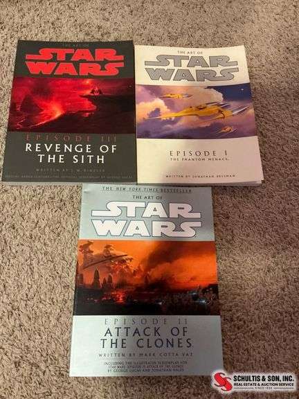 Three softcover Star Wars art books: Episodes I-III. Includes detailed illustrations and behind-the-scenes insights. Minor wear visible.