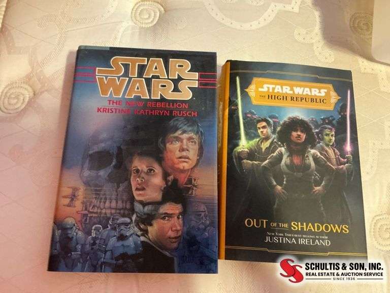 Two Star Wars hardcover books: 'The New Rebellion' by Rusch and 'Out of the Shadows' by Ireland. Minimal wear noted.