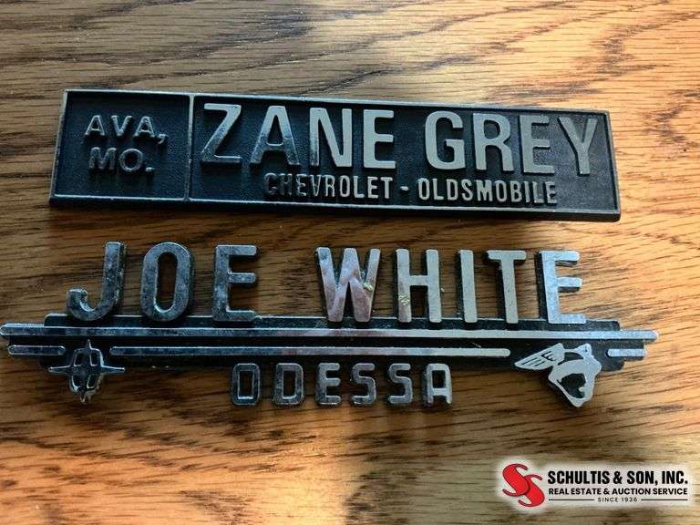 Two vintage car dealer emblems: 'Joe White Odessa' with geometric accents and 'Zane Grey Ava, MO, Chevrolet-Oldsmobile.' Features original adhesive remnants.