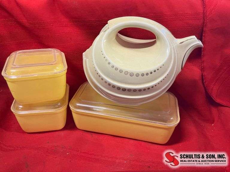 Includes a Hall 6-cup teapot (marked on base) and three refrigerator dishes with lids, in matching yellow glaze. All items show light wear consistent with age.