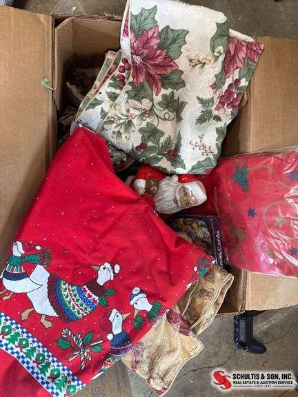 Holiday decor including textiles, ornaments, and figurines. Items feature festive themes and holiday motifs. Condition varies across pieces.
