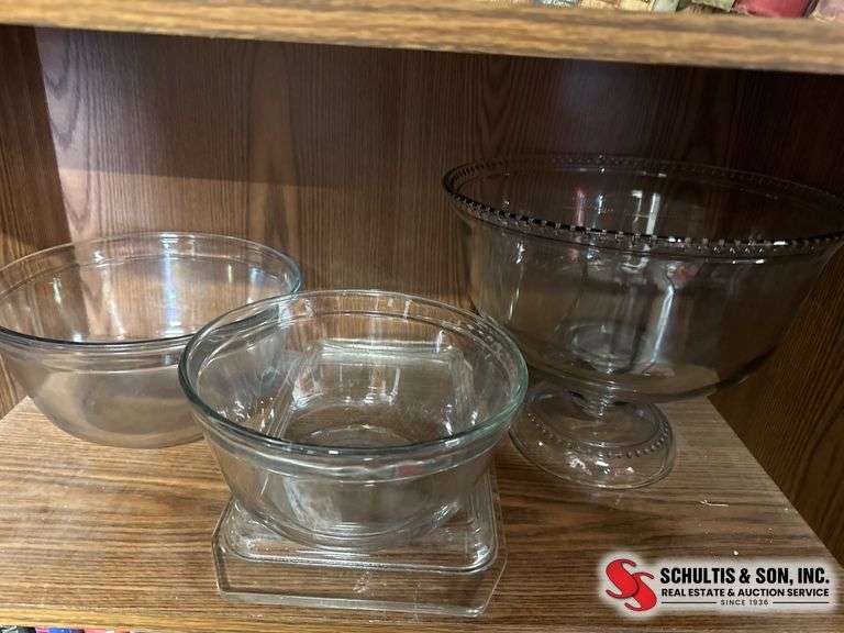 Three glass serving bowls, including a footed bowl with a decorative rim, a circular bowl, and a square-bottom bowl with a flat lid. Exhibits minor wear consistent with previous use.