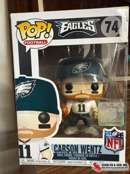 Funko Pop! Vinyl figure of Carson Wentz in Eagles uniform. Box numbered 74 and licensed by NFL. Box shows wear.