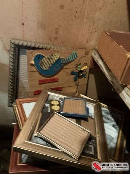 Picture frames in various materials, sizes, and finishes. Includes wood and metal frames, some with glass and backing. Minor wear visible on surfaces.