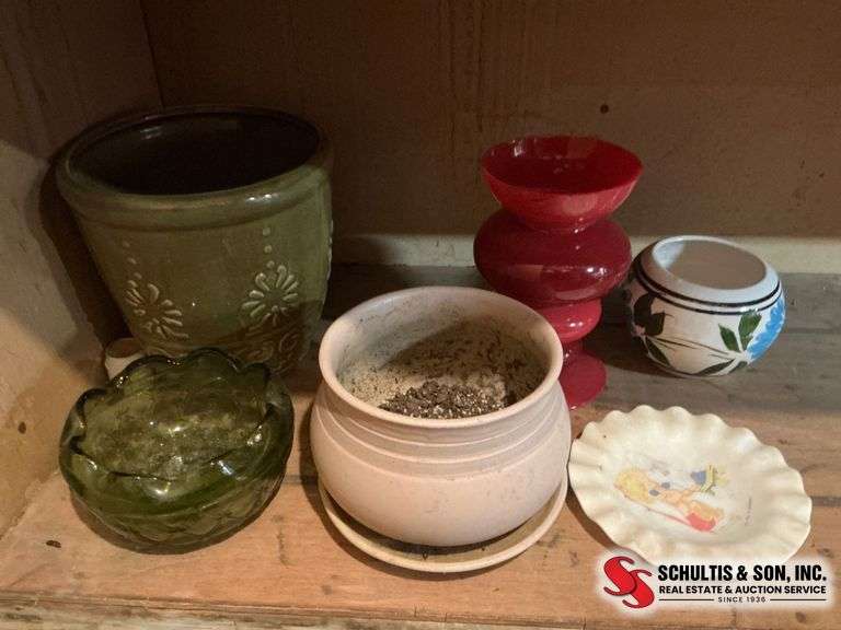 6 mixed items including ceramic planters, a scalloped decorative plate, a red glass vase, and a green glass dish. Used condition with signs of wear.