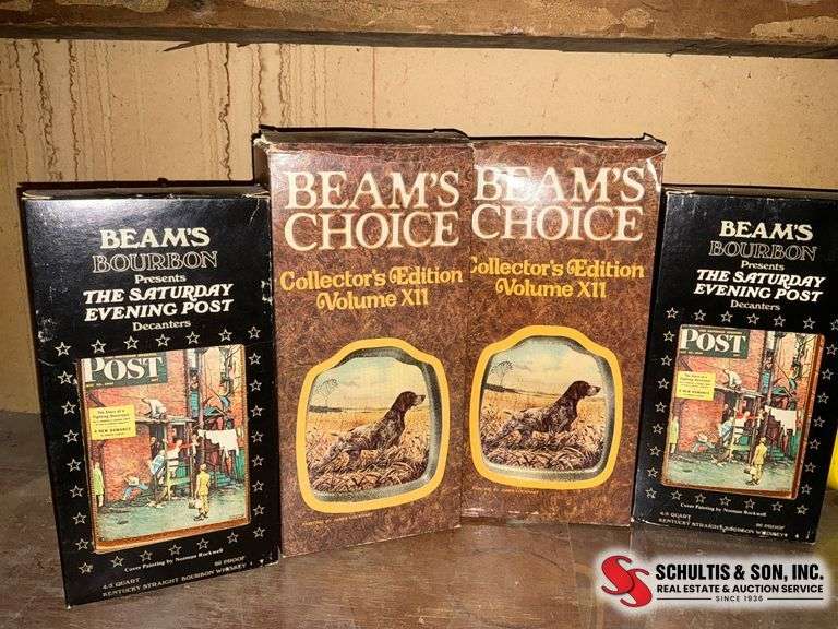 Four Beam's Bourbon collector decanters, including Saturday Evening Post and Beam's Choice. Features intricate designs and artwork. Condition shows wear consistent with age.