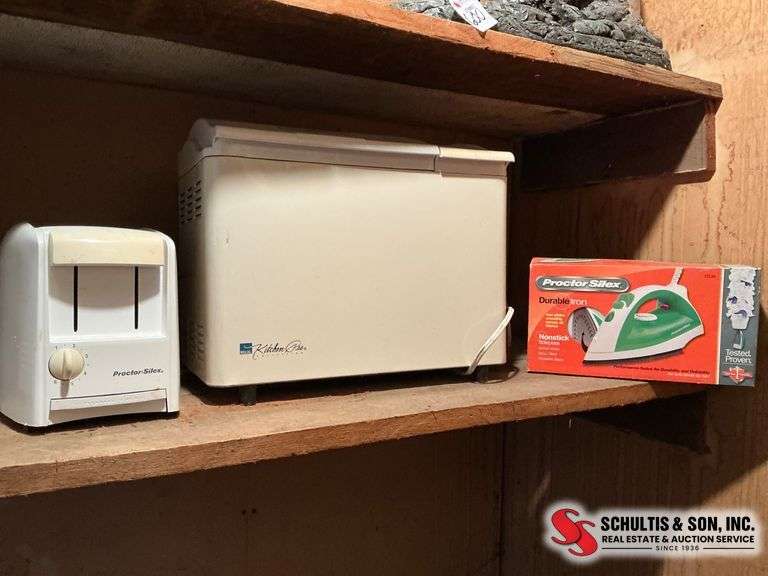 Includes a Regal Kitchen Pro bread maker, a two-slot white toaster, and a boxed Precision-Sonic steam iron. Bread maker has control panel and viewing window. Some signs of use visible.