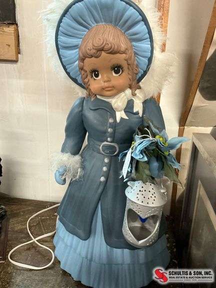 Figural lamp depicting a girl in vintage-style attire. Molded material with integrated lantern and electrical cord. Approximately 2 feet tall.