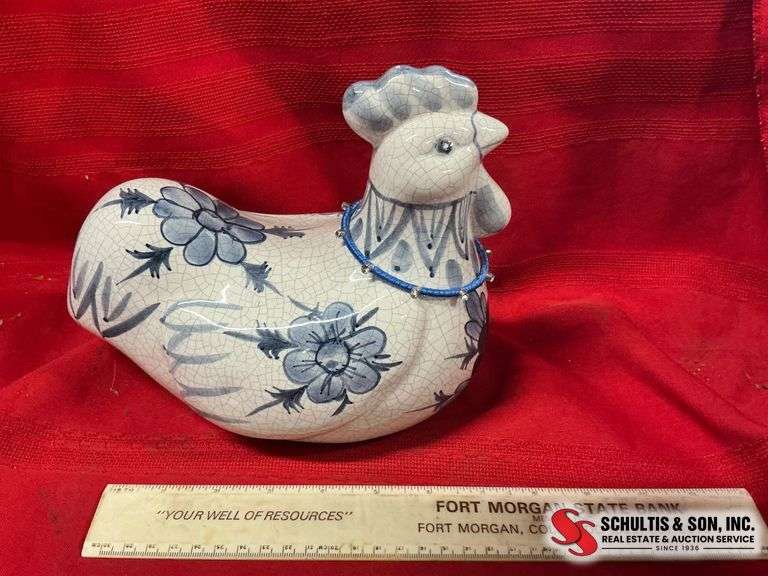 Ceramic hen figure with blue floral designs and crackle glaze. A beaded accent encircles the neck. Approx. 6 inches tall.