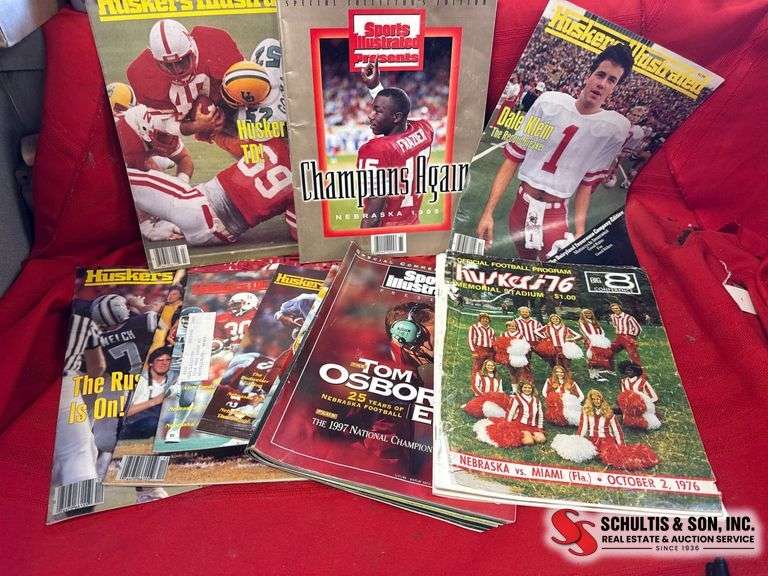 Nebraska-themed sports magazines, including 'Sports Illustrated' and 'Husker Illustrated' titles featuring vintage covers and notable events.