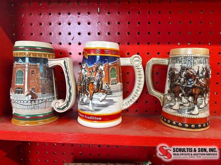 Three Budweiser holiday steins featuring detailed holiday-themed imagery. Includes years 1990, 1991, and 1992. Ceramic construction with sculpted handles and printed designs. Minor wear consistent with display use.