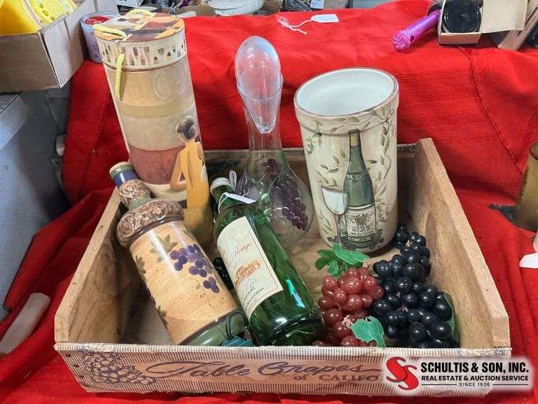 Wine-themed decor includes glass and ceramic pieces shaped like bottles, a pitcher, a wine box, and faux grapes. Minor wear visible.