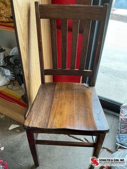 Wood chair with slat-back design and rectangular seat. Crafted from dark-stained wood with visible grain. Exhibits wear consistent with use.
