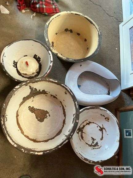 Enamel-coated metal basins, including various sizes and one chamber pot. Displays chipping and rusting in areas. Dimensions and additional details upon request.