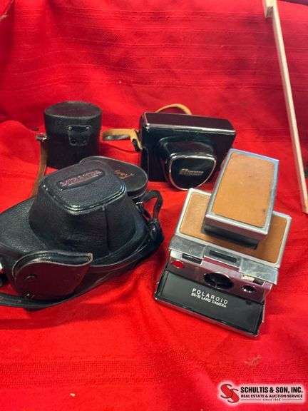 Vintage Polaroid cameras and leather cases. Includes various models with metallic and leather finishes. Condition varies; wear consistent with age.