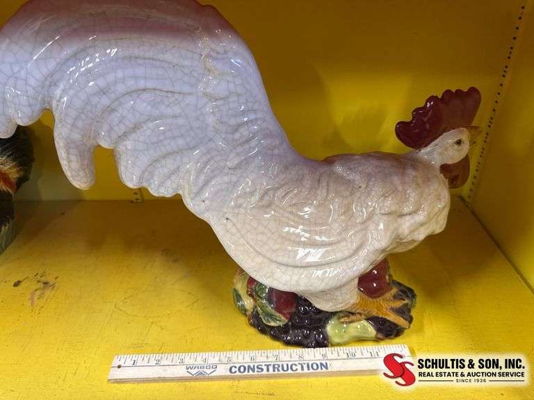 A glazed ceramic rooster figurine with crackle finish and colorful details, measuring approximately 11 inches tall.