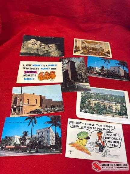 Eight vintage postcards featuring landmarks, humor, and travel-related themes. Includes Mount Rushmore and Miami Hotel cards. Mixed used and unused condition with handwritten notes on select cards.