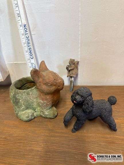Includes a rabbit planter with weathered finish, black poodle figure, and metal squirrel on hook. Minimal wear visible.
