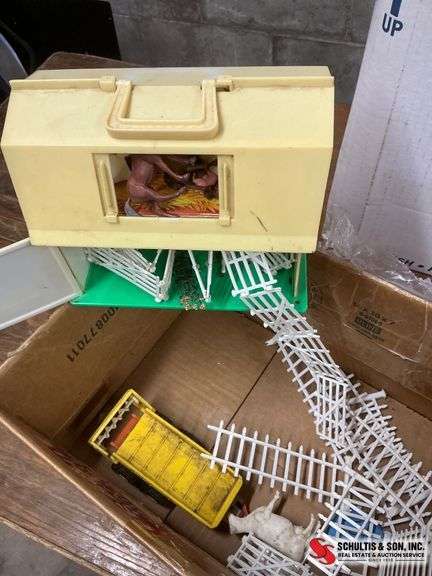 Two molded plastic horses with synthetic manes, plastic barn, fencing, and assorted accessories. Visible wear and scuffing throughout.