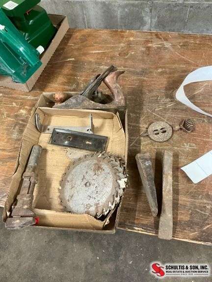 Handsaw, adjustable wrench, wood plane, wedges, and gear pieces. Items exhibit rust and wear.