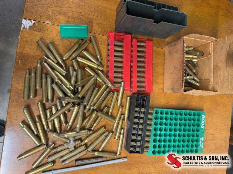 Brass casings, red ammo trays, an RCBS loading block, and assorted reloading supplies. Items show wear from use.