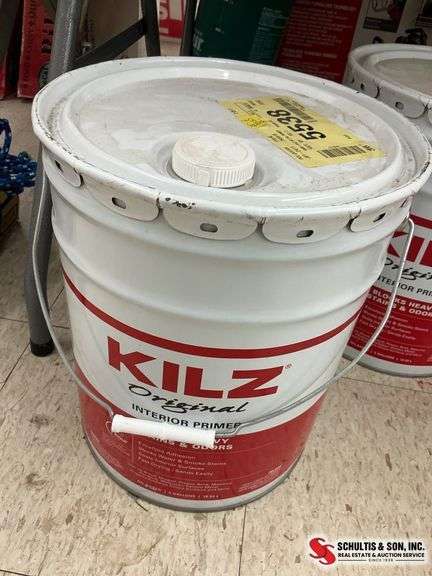 55-gallon drum of Kilz Original Interior Primer, labeled as a flammable liquid. Appears unused with intact seal.