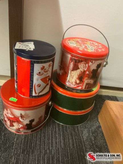 Metal holiday-themed tins featuring Santa Claus and Coca-Cola imagery. Includes various sizes with lids and handles, all with festive designs.